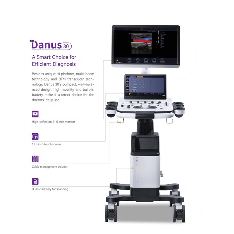Echografiemachine is een slimme keuze voor efficiënte diagnose. Naast het unieke Hi-platform, multi-beam-technologie en BTM-transducertechnologie, het compacte, uitgebalanceerde ontwerp van de Danus 30, de hoge mobiliteit en de ingebouwde batterij maken het is een slimme keuze voor dagelijks gebruik door artsen.