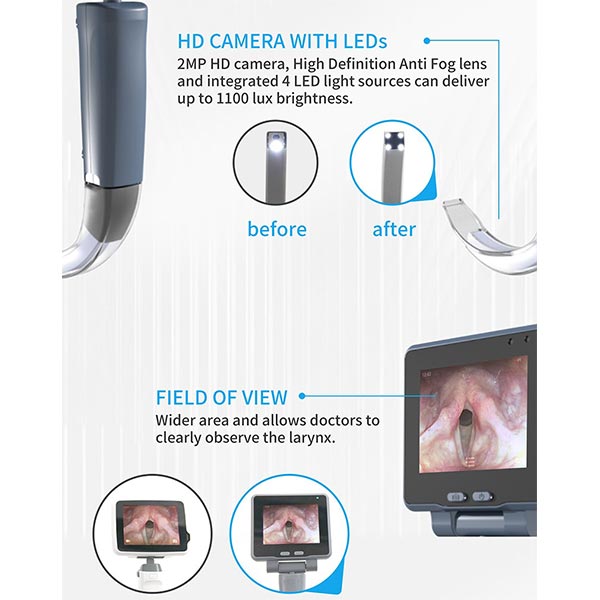 3. Breed gezichtsveld: we hebben de kijkhoek van deze laryngoscoop mooi en breed gemaakt, zodat u een veel groter en duidelijker zicht krijgt. Artsen en operators kunnen de larynxstructuur gemakkelijk zien, alle kleine anatomische details opvangen en procedures uitvoeren sneller en nauwkeuriger gedaan